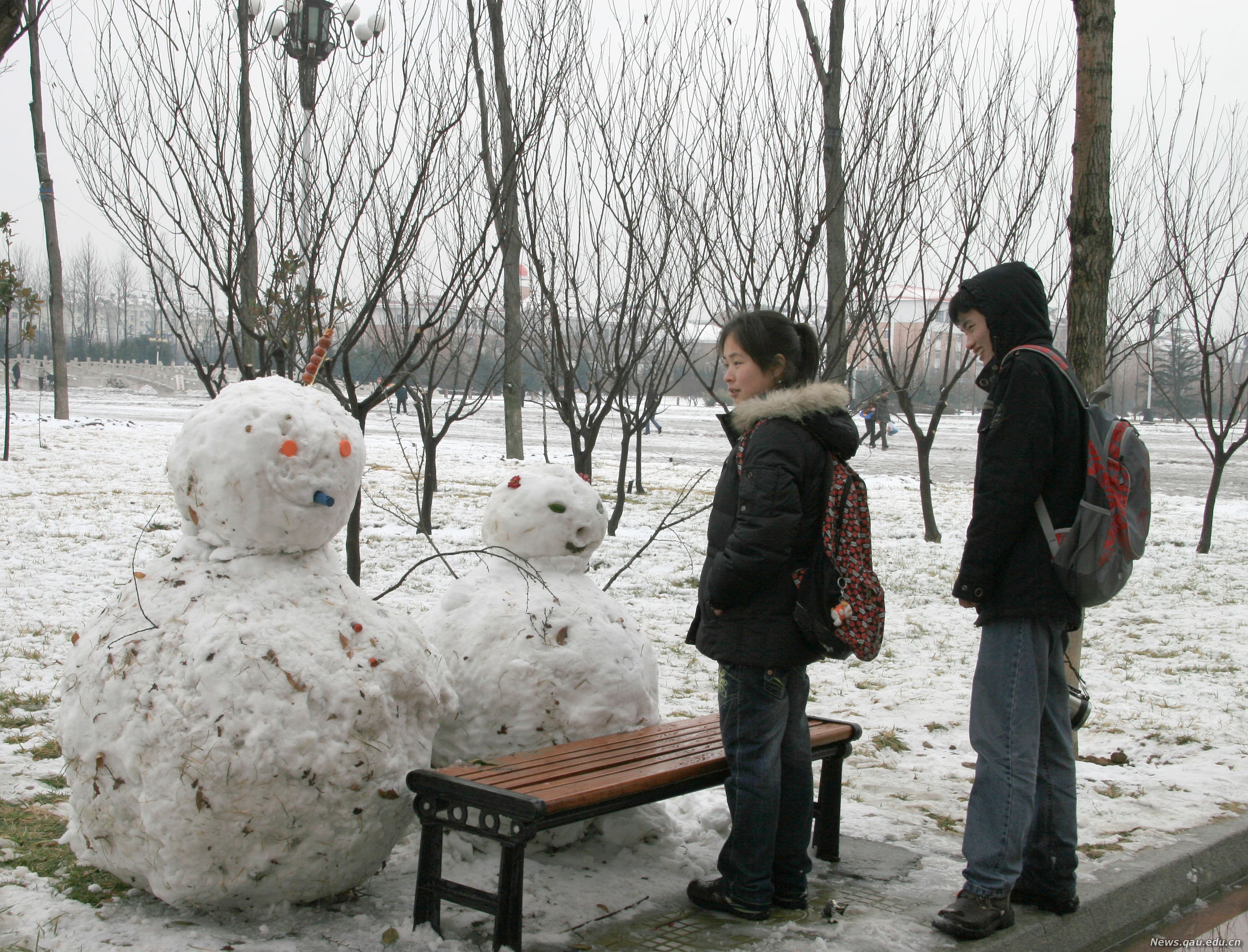 两位学生在校园里观察两个雪人